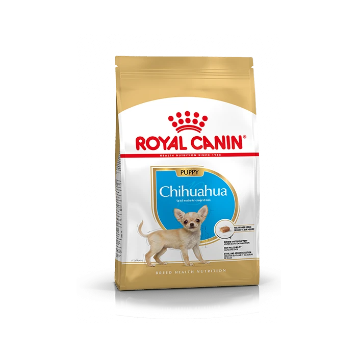 Aliment complet pour chiens – Spécialement conçu pour un Chiot Chihuahua, de 2 à 8 mois. La période de croissance est une étape importante pour votre chiot Chihuahua. C’est pourquoi il est essentiel de lui procurer des nutriments qui favorisent une santé optimale. ROYAL CANIN® Chihuahua Puppy est spécialement formulé pour répondre à tous les besoins nutritionnels de votre jeune Chihuahua et convient aux Chihuahua de moins de 8 mois. ROYAL CANIN® Chihuahua Puppy est très appétissant et peut satisfaire les palais des Chihuahua les plus exigeants. Grâce à son complexe d’antioxydants (dont la vitamine E), ROYAL CANIN® Chihuahua Puppy aide à renforcer les défenses naturelles de votre chiot tout au long de sa croissance. Le mélange de nutriment de haute qualité que contient ROYAL CANIN® Chihuahua Puppy contribue également au maintien de la santé digestive et à réduire les odeurs et le volume de selles. De plus, les croquettes ROYAL CANIN® Chihuahua Puppy sont conçues sur mesure. En effet, les chiens de race Chihuahua ont une petite mâchoire, les croquettes sont adaptées à la petite mâchoire du chiot Chihuahua, pour lui faciliter la prise et la mastication de la nourriture.