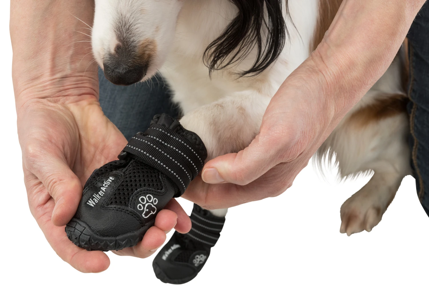 Chaussure pour chien qui protĂ©ge la patte endommagĂ©e. RĂ©duit les risques d’infection des plaies par la saletĂ©. Protège les pattes du sel et des gravillons de la route en hiver.